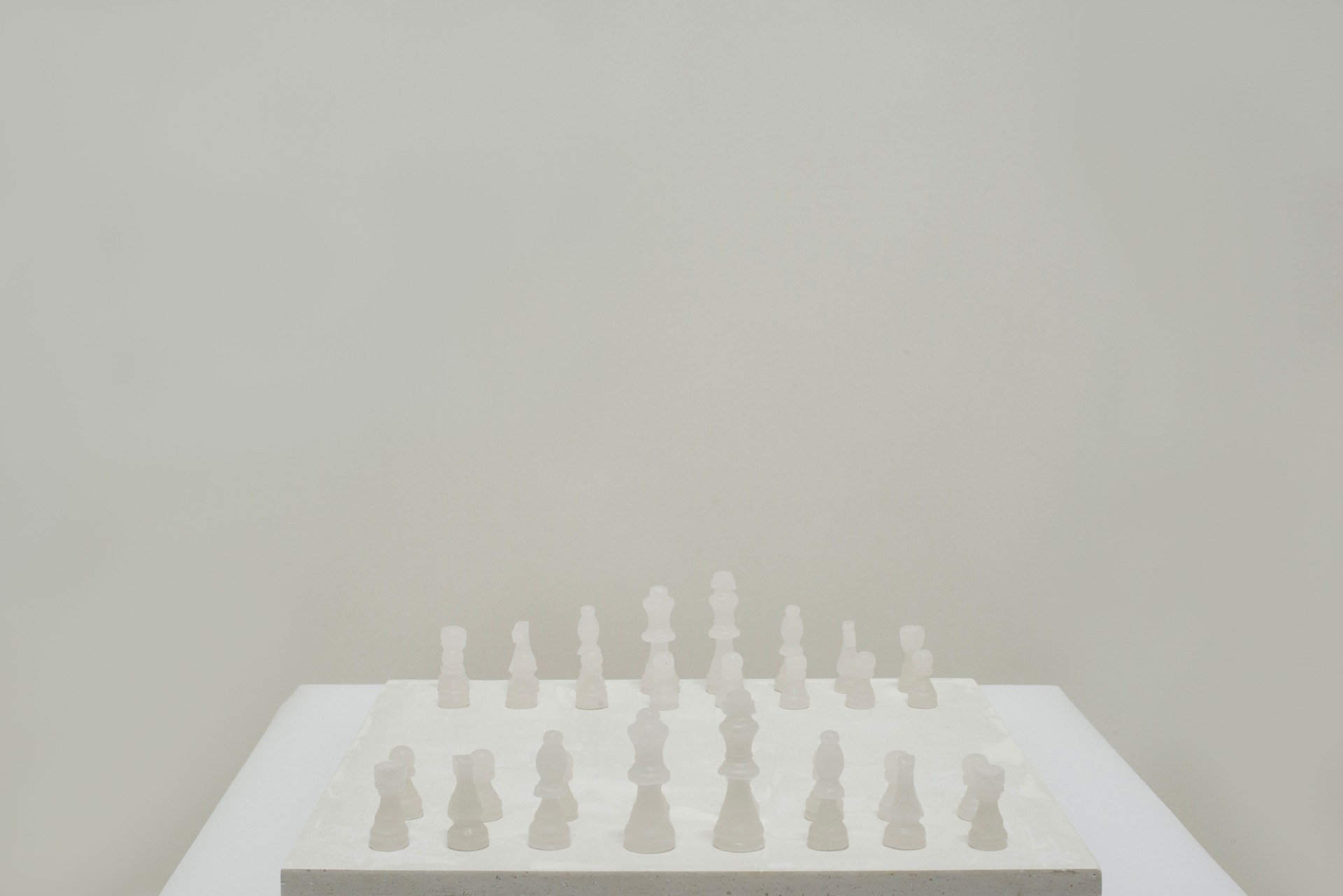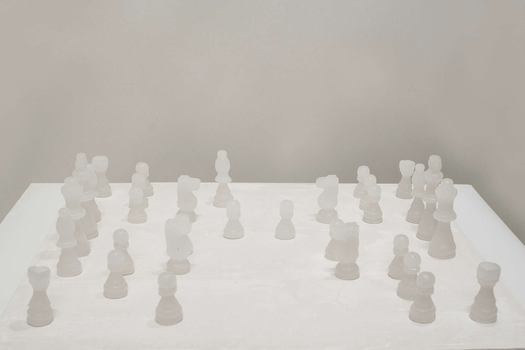 1) Una scacchiera con i propri pezzi, la scacchiera è di cemento bianco, i pezzi sono in cera e tutti dello stesso colore, l'assenza di "case" e di colore trascina tutto in una dimensione asettica, dove il tutto appare congelato in un frangente di partita, dove quest'ultima non è più giocabile.