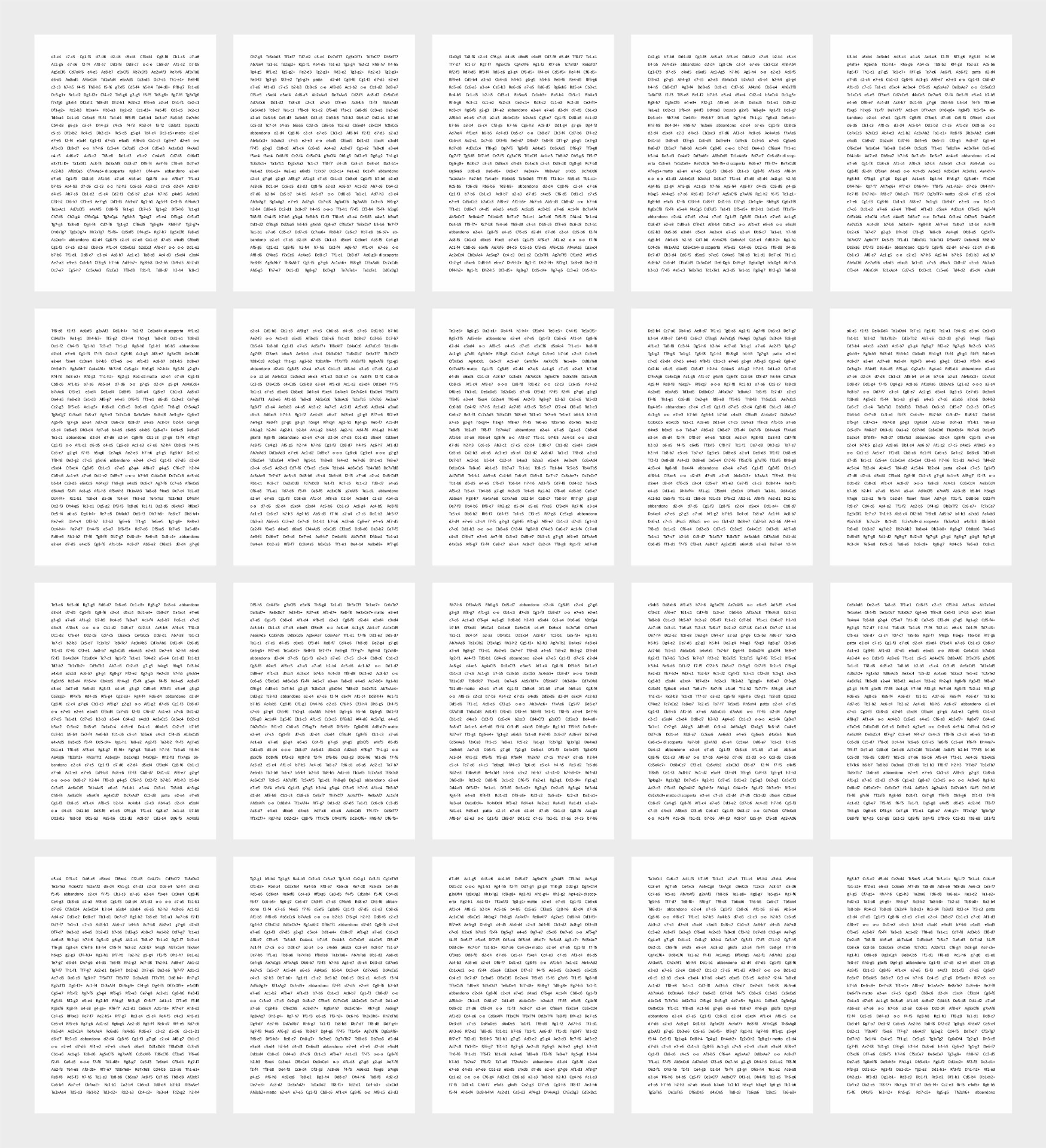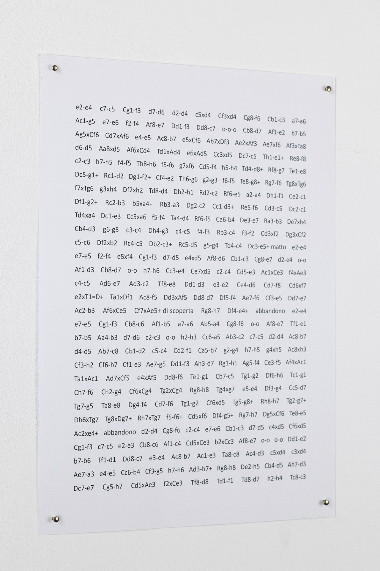 3) The second part of the work is made up of many games of international masters that we have played, studied and transcribed, making them become like a dialogue between us. It is a work focused on the dynamics of life through the chess metaphor. << Chess is life >>, chess is life, so said Bobby Fisher, legendary world champion. The chessboard considered as a world, our world, the game and its evolution as the passing of time of existence, made up of moves and therefore actions and consequences. e2-e4 reflects and wants to make people reflect on everyday life, the choices that inevitably condition oneself and the other.