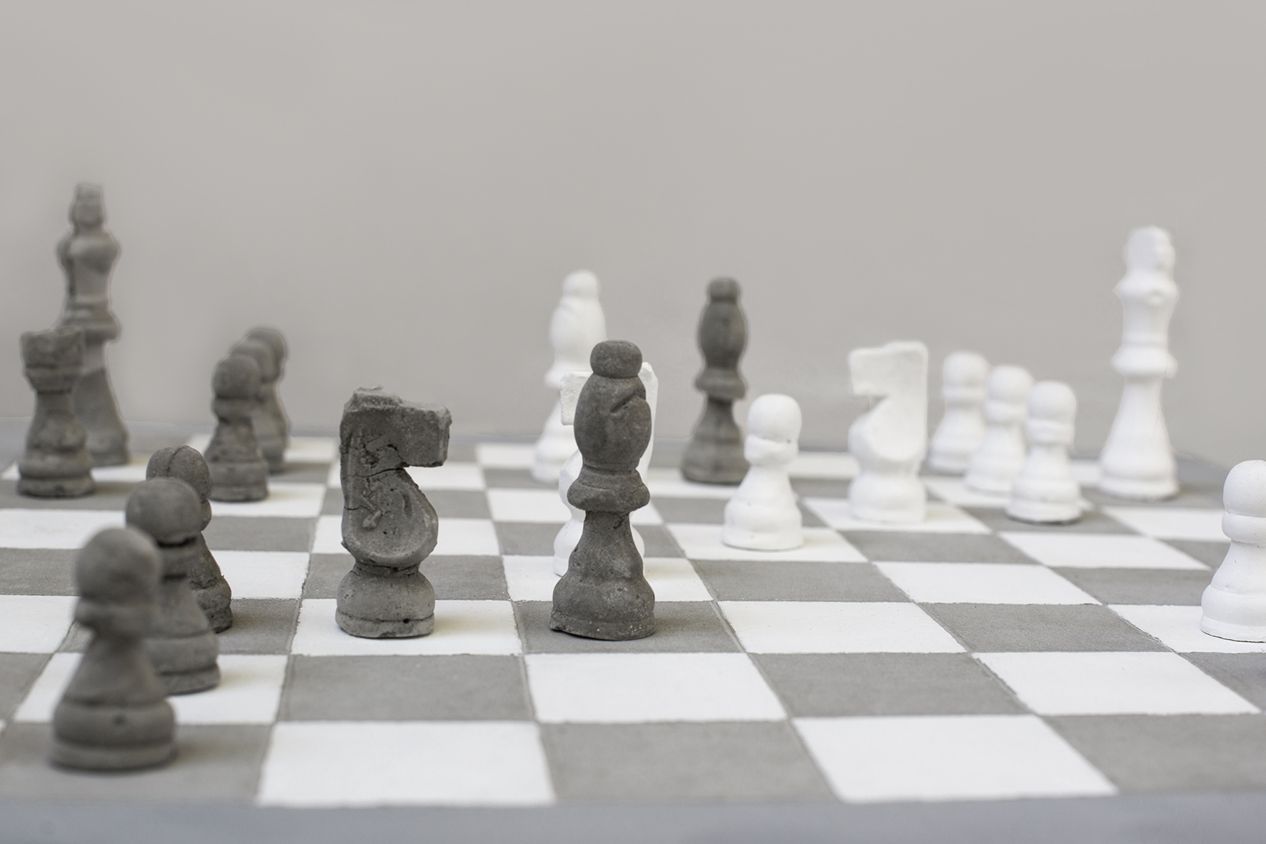 1) A chessboard with its own pieces, the chessboard is of white concrete, the pieces are wax and all of the same color, the absence of "houses" and of color drags everything into an aseptic dimension, where everything appears frozen in a game situation, where the latter is no longer playable.